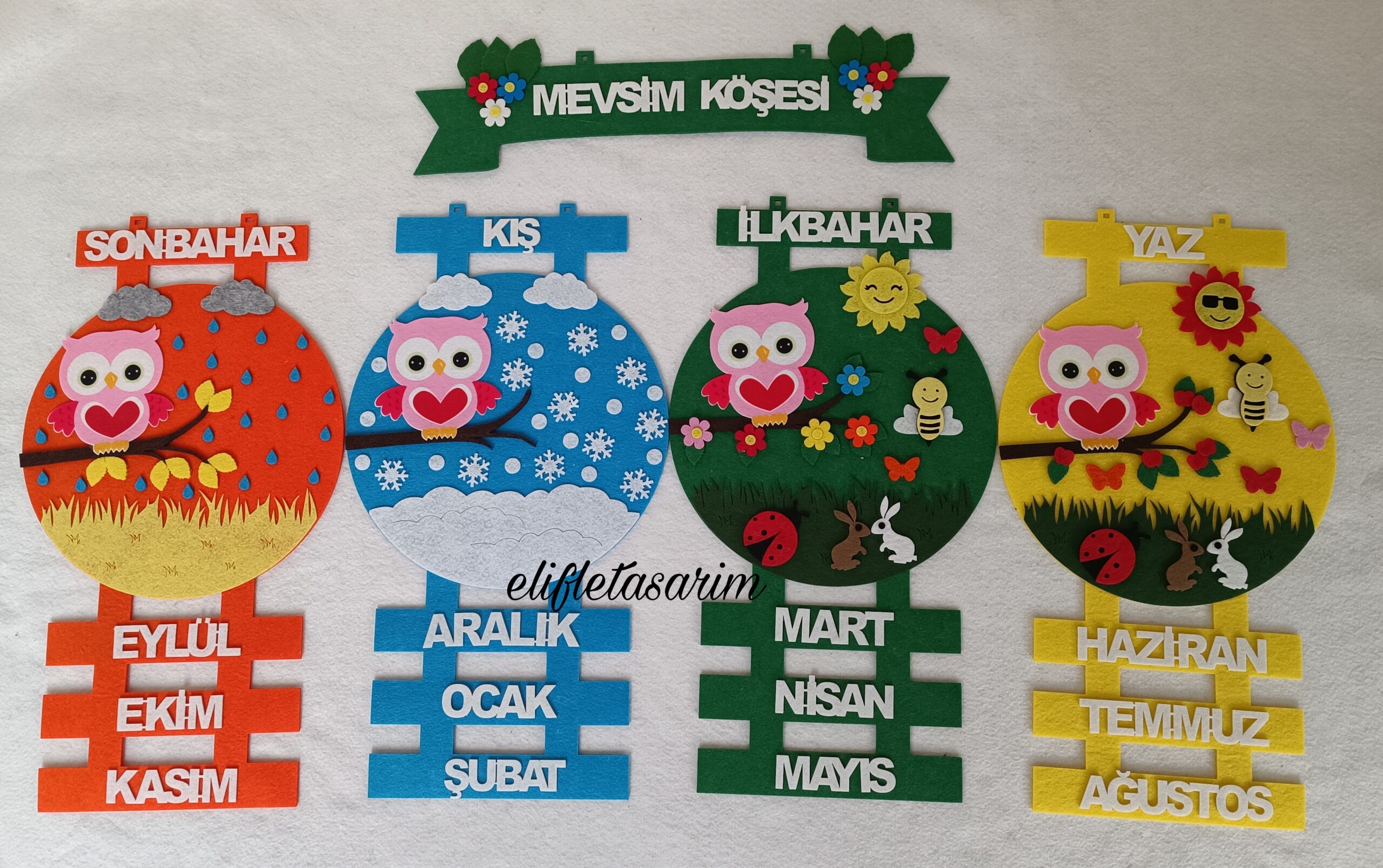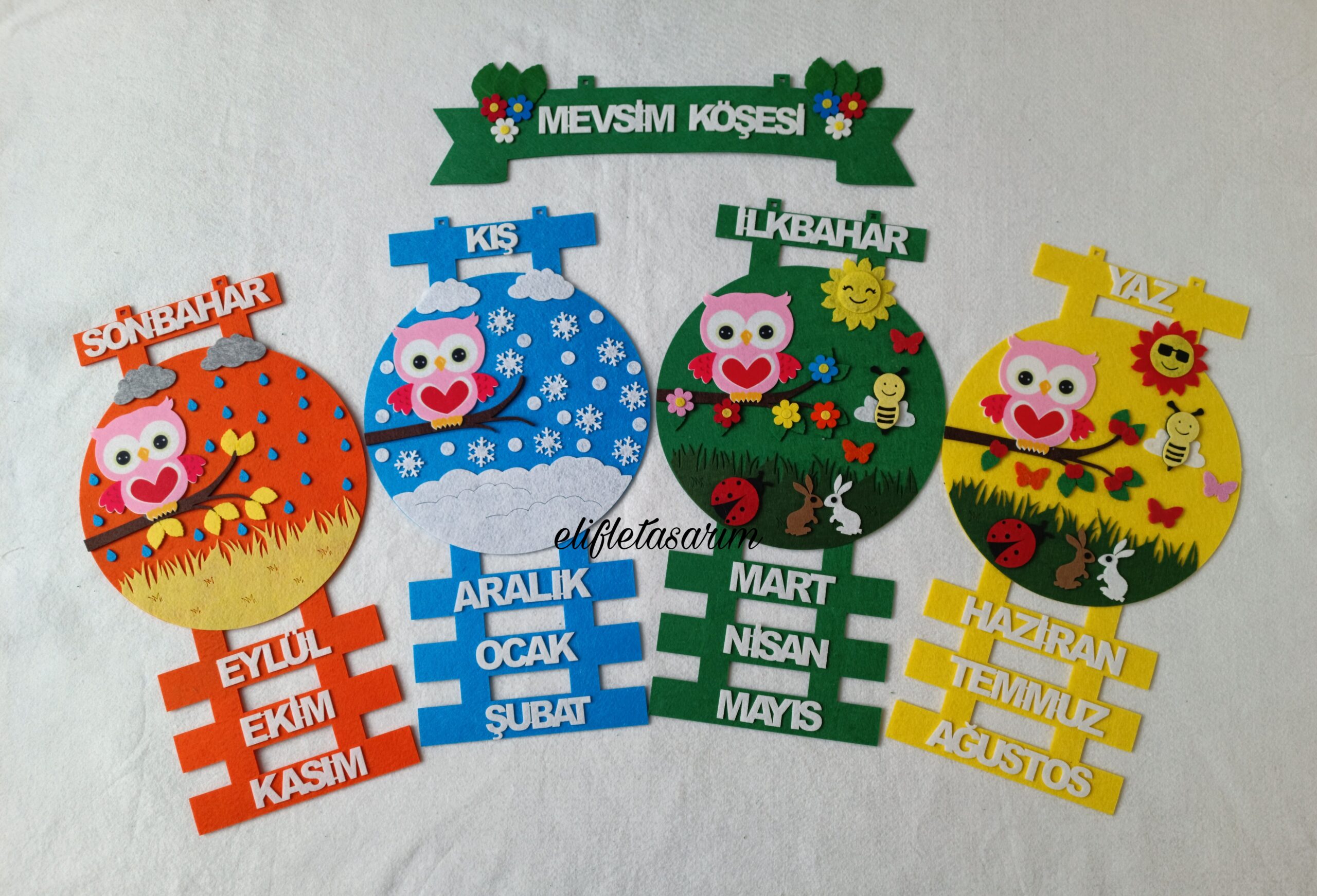 4 mevsimi görseller ile anlatımlı, kalın keçeden hazırlanan mevsim şeridi köşesi. Bir mevsim Boyutu 55 cm uzunluğunda, 30 cm genişliğindedir dörtlü olarak 120 Cm 55 cm dir