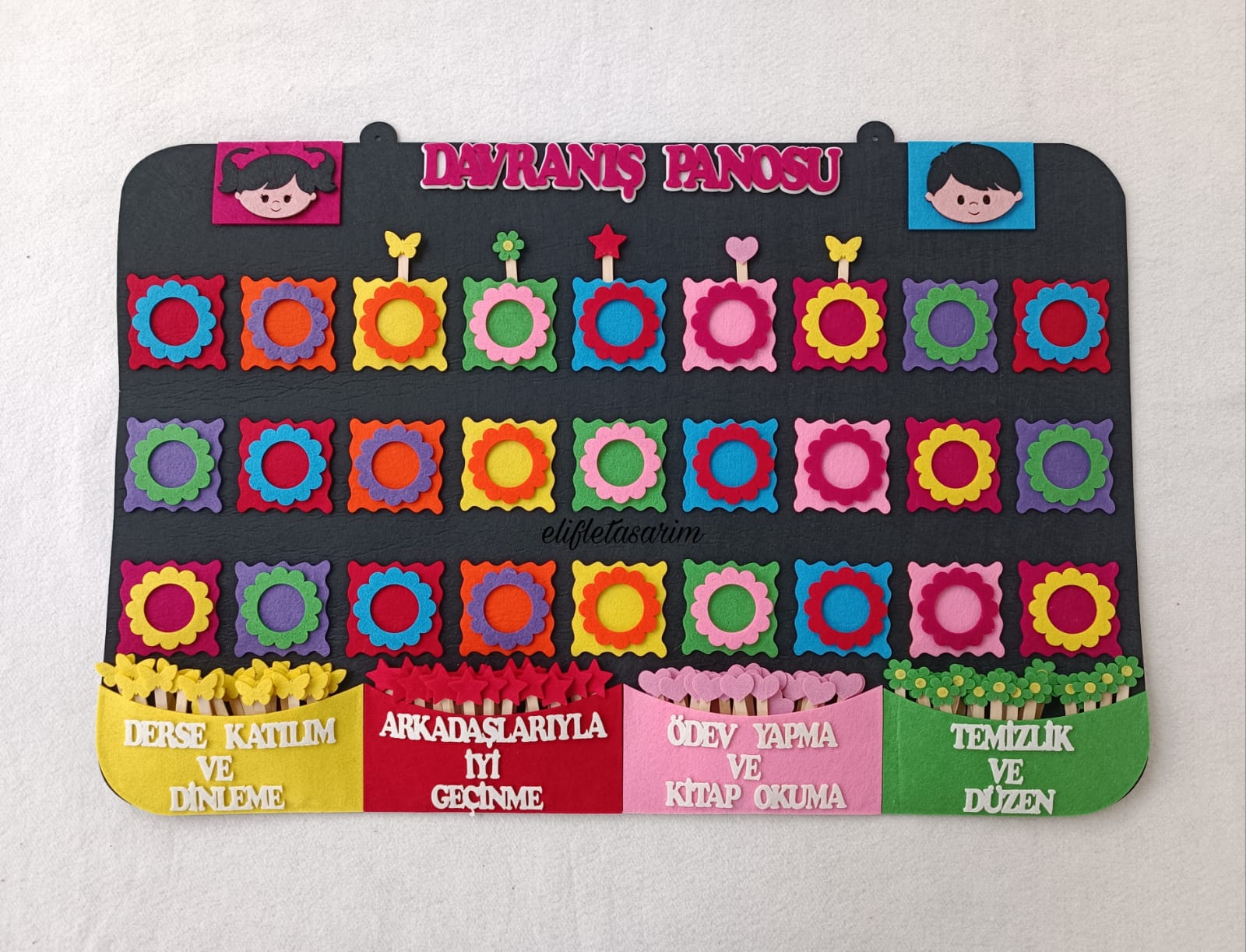 Davranış panosu Tamamen kalın keçeden yapılmıstir. Cerceve sayıya göre fiyati düzenlenmektedir.Resimdeki model 27 kişilik olarak yapılmıştır. İstenilen kişi sayısına göre yapılabilir.