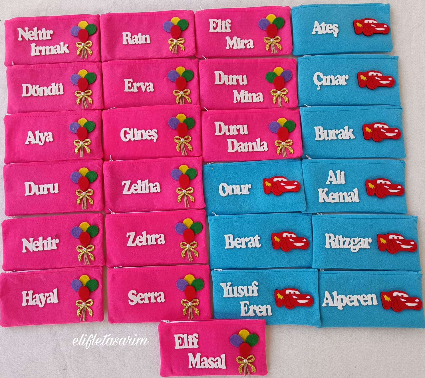 İnce keçeden yapılmıstir. Etrafı makinede dikilmiştir. Fermuarlı dir Adet fiyatı olarak yazılmıştır. Adet sayısını belirttikten sonra NOT BÖLÜMÜNE isim listeni kiz erkek olarak ayrı ayrı yazabilirsiniz.