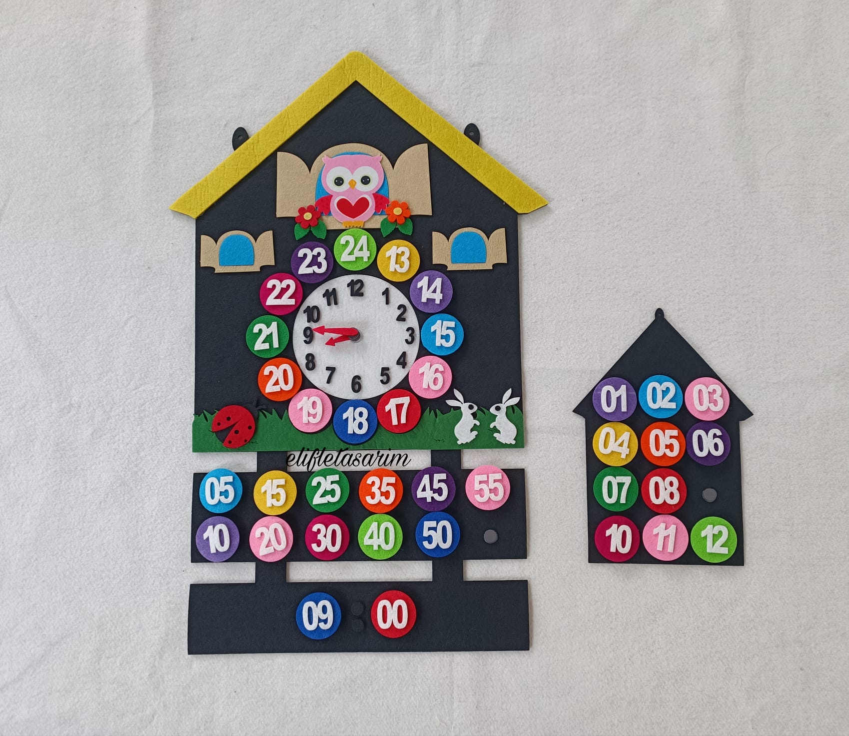 Tamamen kalın keçeden yapılmıştir. Mıknatıslı dir dakika ve saatleri istediğiniz şekilde ayaiyabilirsiniz.Boyutu 60 cm 45 Cm dir