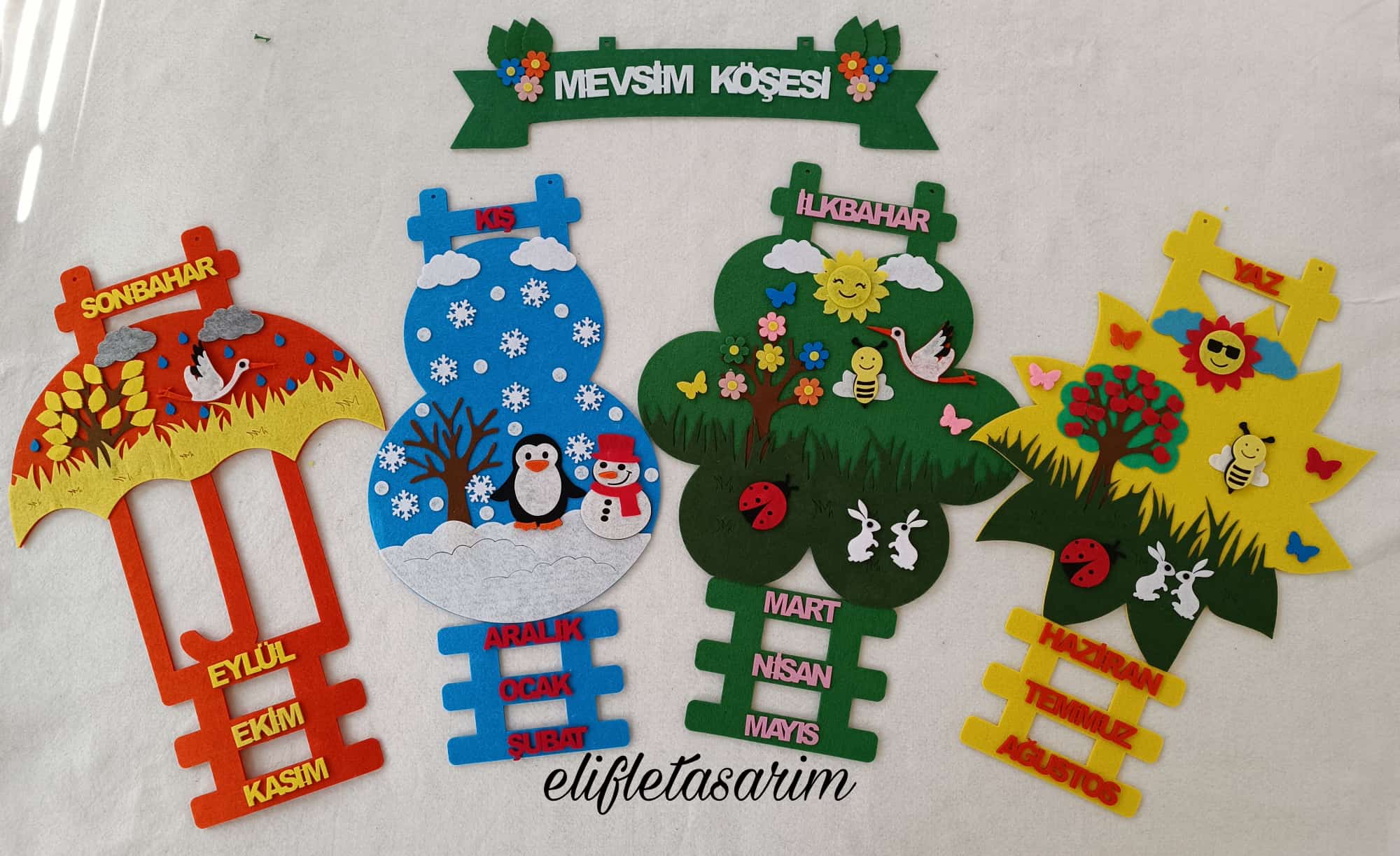4 mevsimi görseller ile anlatımlı, kalın keçeden hazırlanan mevsim şeridi köşesi. Boyutu 60 cm uzunluğunda, 40 cm arasında değişir boyutları.